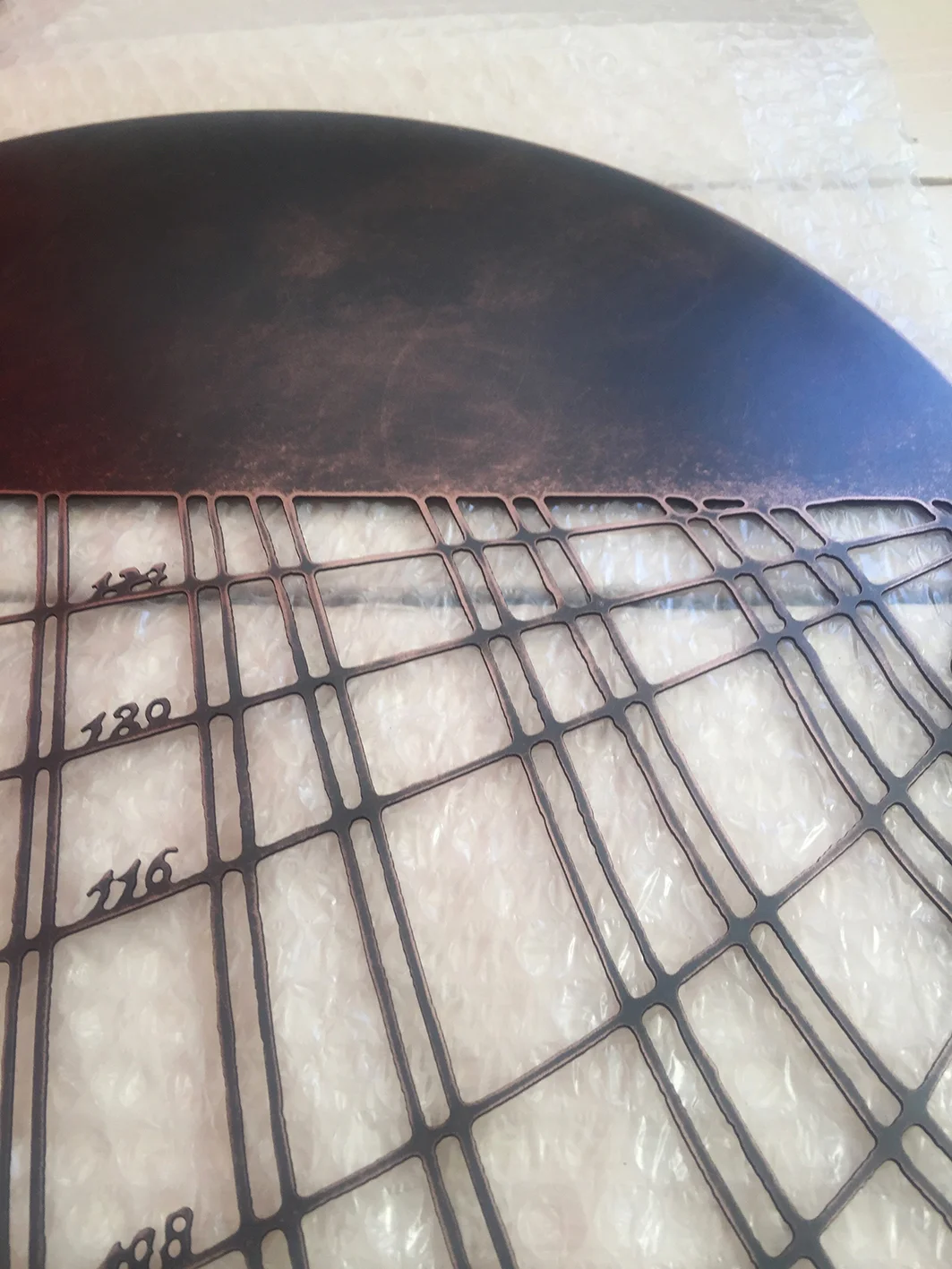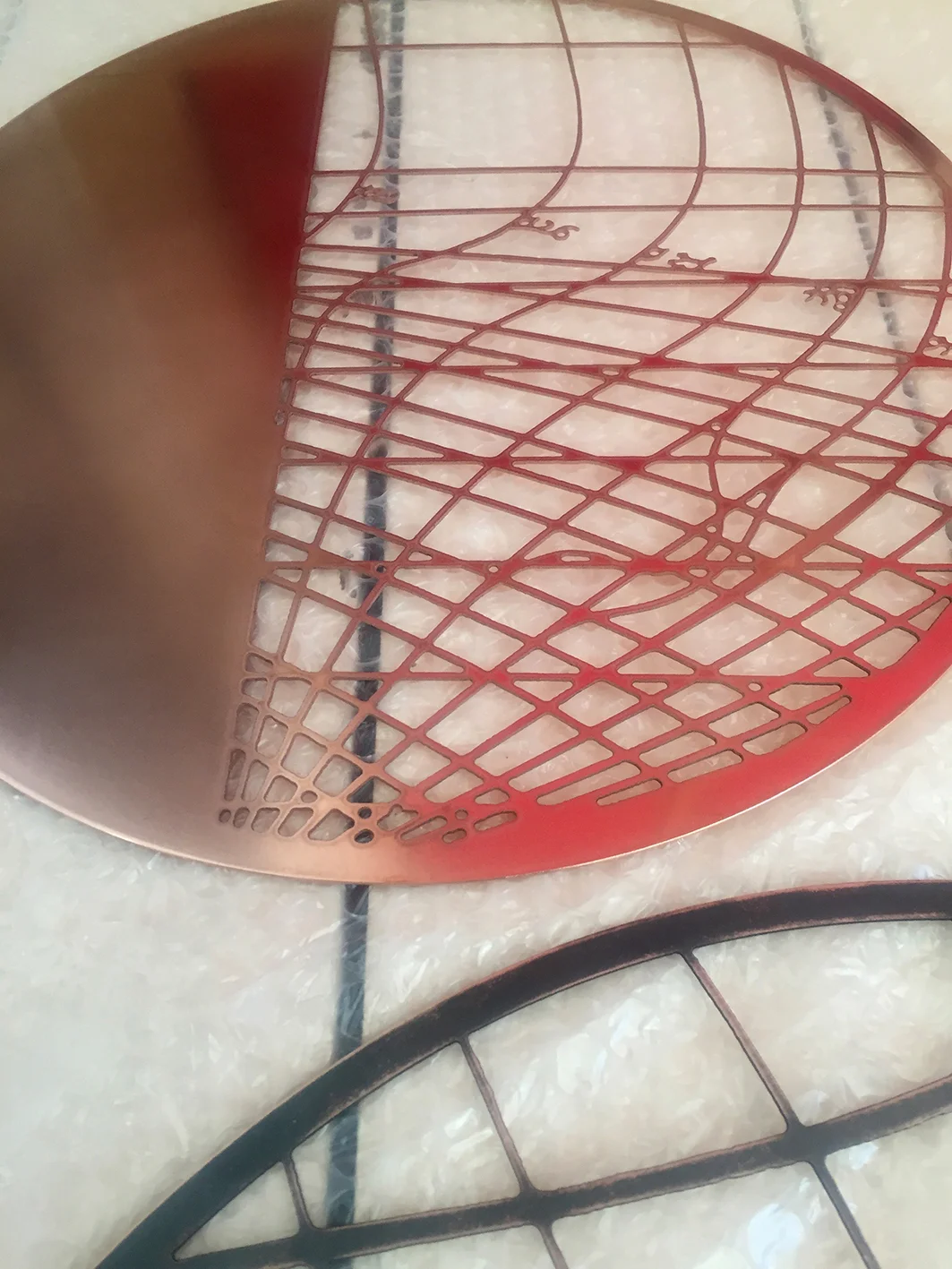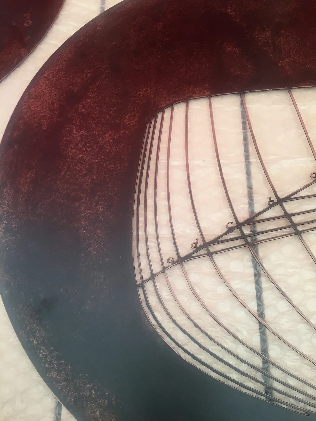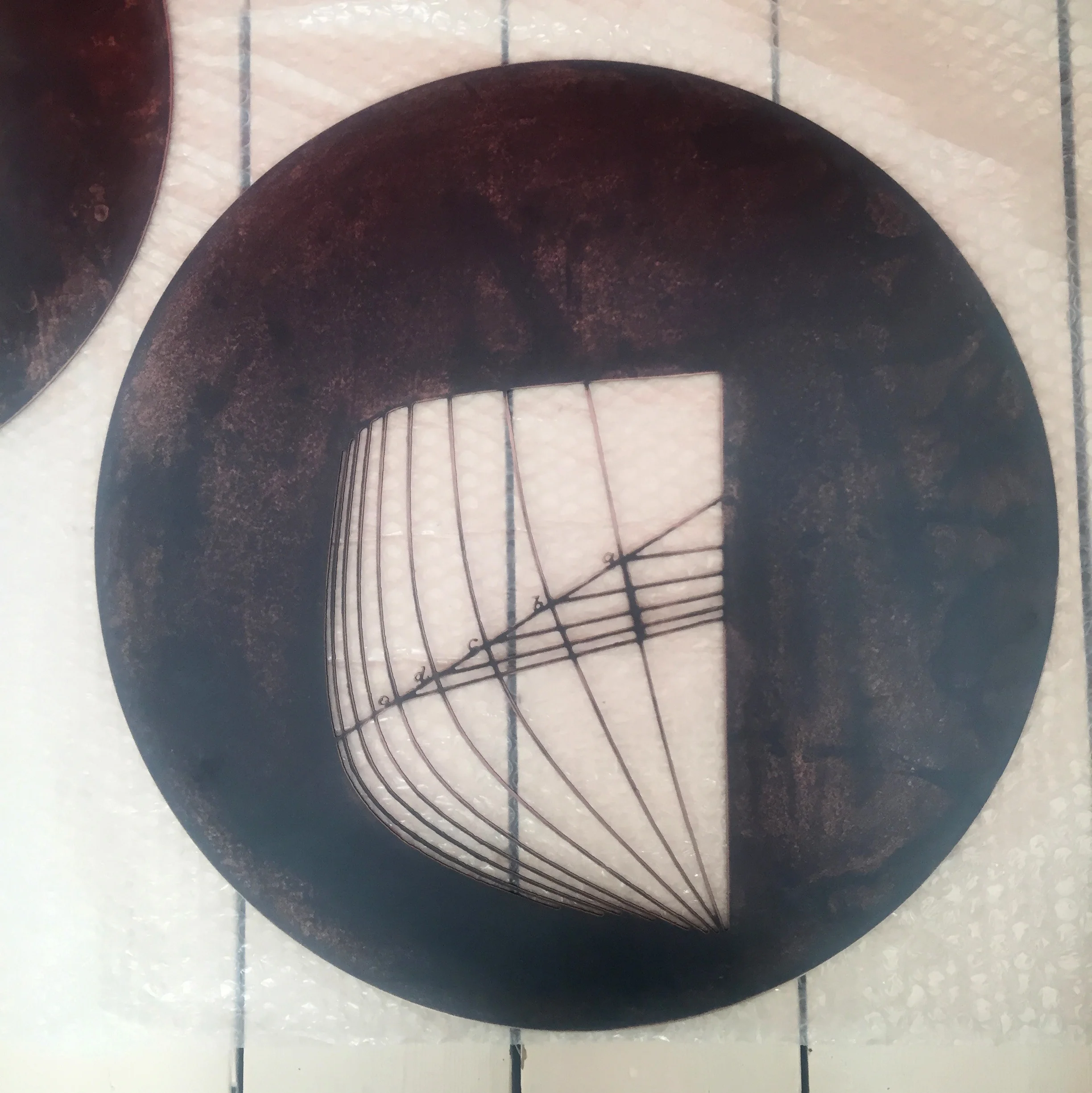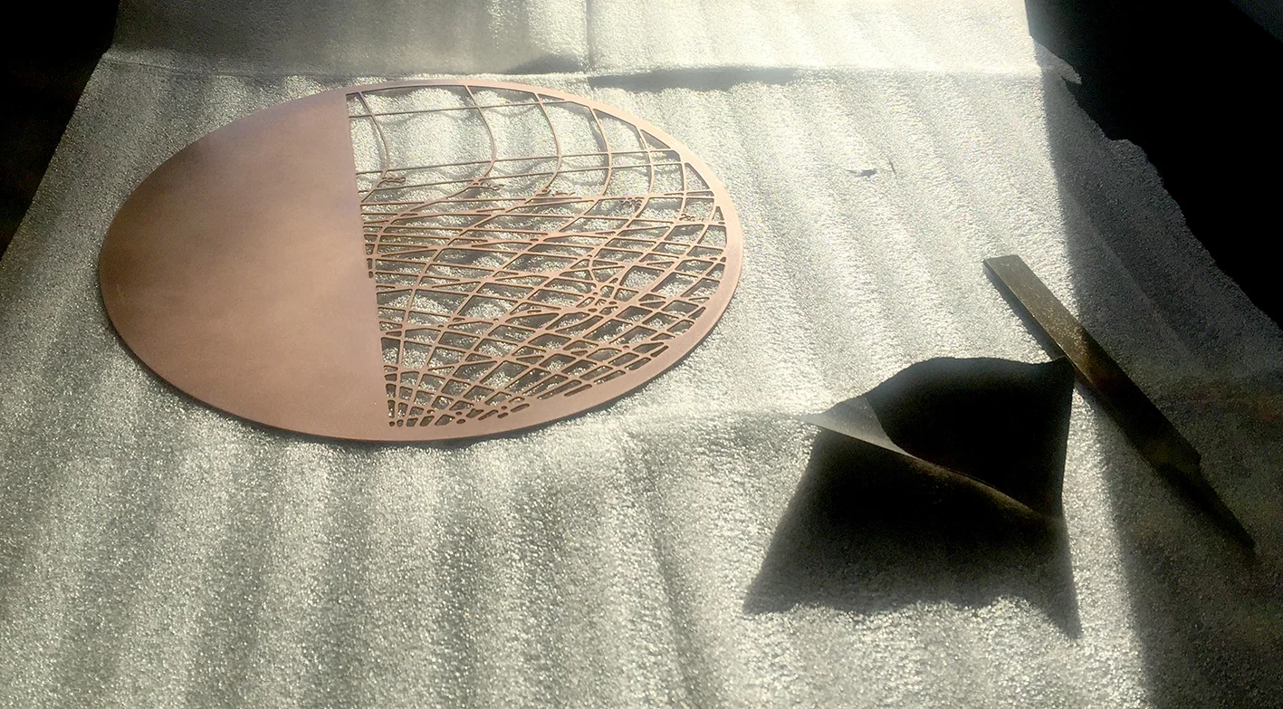 This piece was designed to be seen from both sides of the glass, with delicate shapes based on historic shipbuilding diagrams, cut out of the metal discs. This imagery is so appropriate for Hamburg, a city with a rich maritime history, like Liverpool, where I live and work.